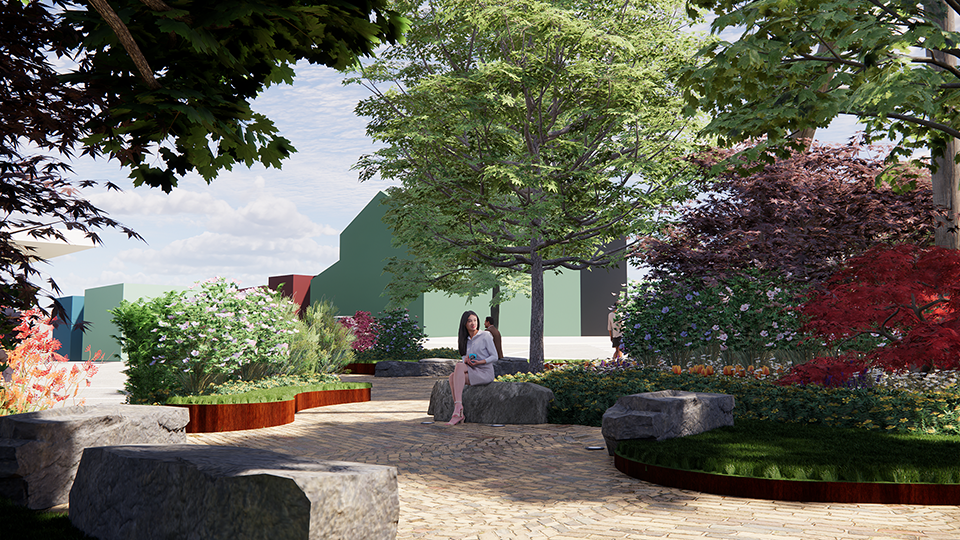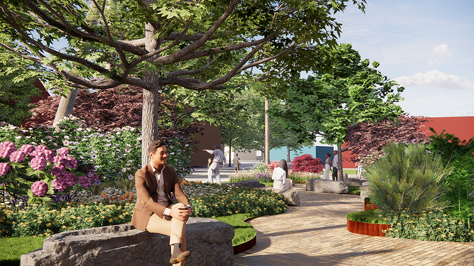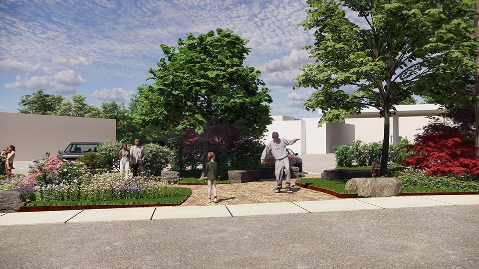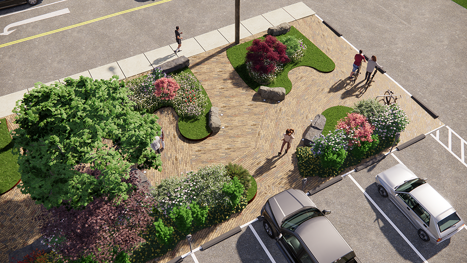Local businesses and government, with funding from a State University of New York (SUNY) Research Grant, collaborated on the design solution, a small park with an open planting plan: green islands create circulation paths through the park and gathering places within it; low and medium planting heights define spaces while facilitating pedestrian and parking lot safety; and the seasonal plant selections sustain new visual experiences throughout the year. Native plants are specified, creating forage for bees, butterflies and other pollinators, and the prescribed plant species are low maintenance perennials. Sustainable aspects include water permeable “cool” pavements and a bike station. The planned stone benches are locally sourced from the Shawangunk Ridge.