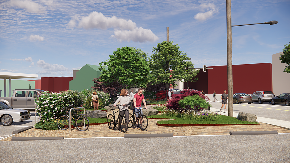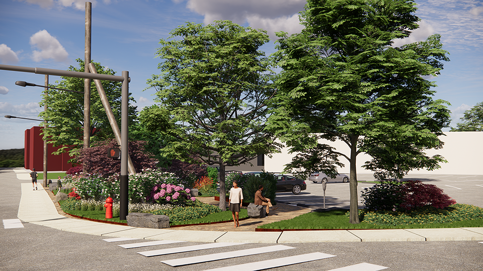 New Paltz, NY | A pocket park design for the bustling corner of Main and North Chestnut Streets, in the heart of downtown New Paltz.